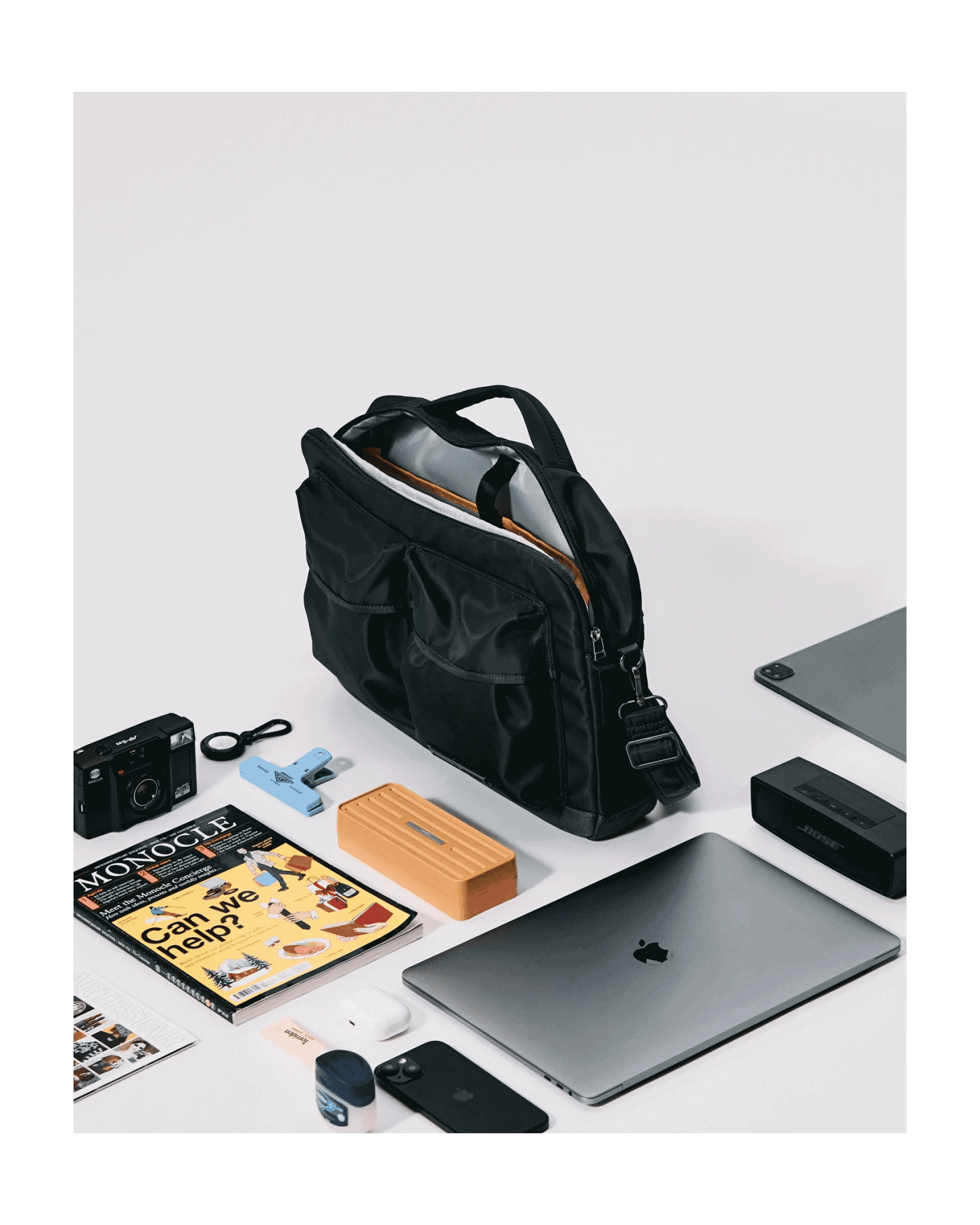 With a detachable strap, it can be worn as a tote or crossbody bag. An internal foldable base panel allows the bag’s shape to be adjusted according to load volume or personal preference.