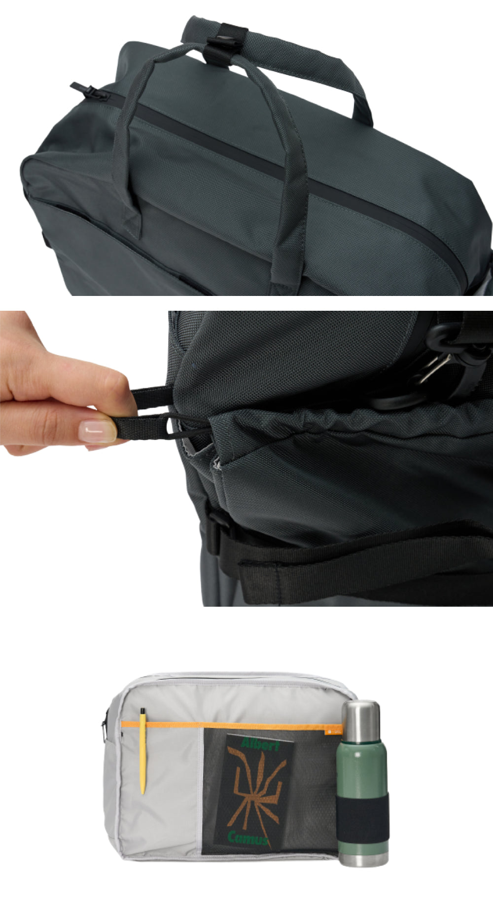 ▪ One-touch buckle webbing on the sides allows the bag to be expanded or compressed, and the string pockets include built-in accordion bands, making it easy to store larger items.